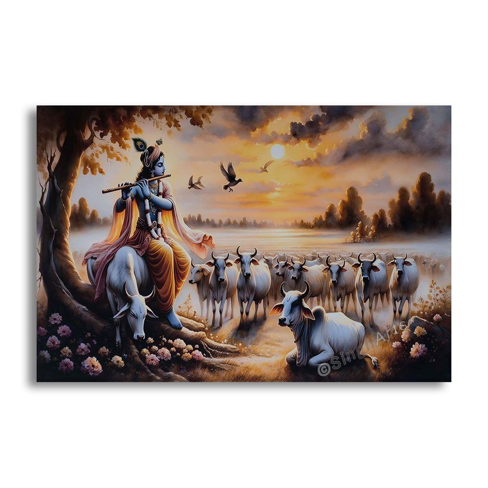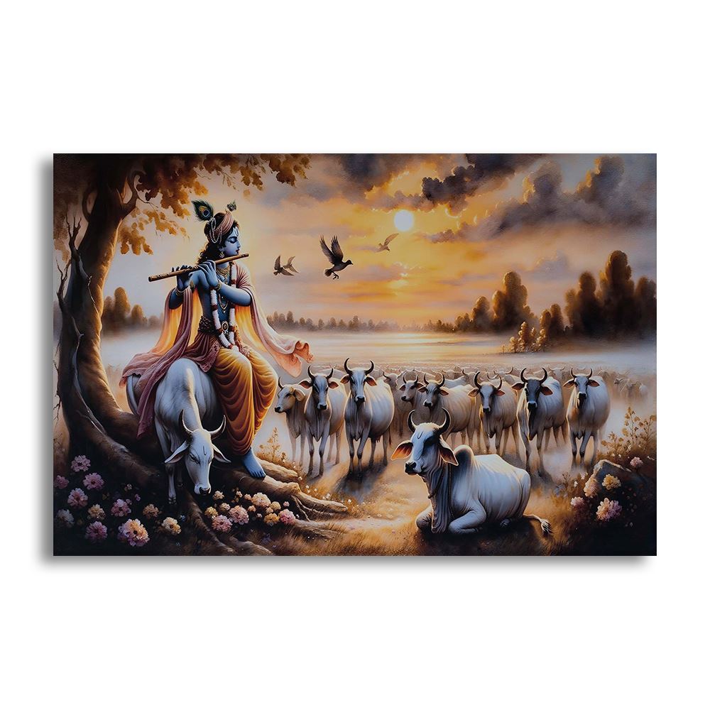 Surrounding Krishna is a gentle gathering of cows, symbolizing purity, abundance, and harmony in Hindu tradition. The cows stand calmly, drawn toward the divine music of the flute, while birds glide through the sky, reinforcing the idea that all of nature responds to God’s presence. The flowing garments, peacock feather, and flute serve as clear symbols of Lord Krishna’s identity and divine leela.
