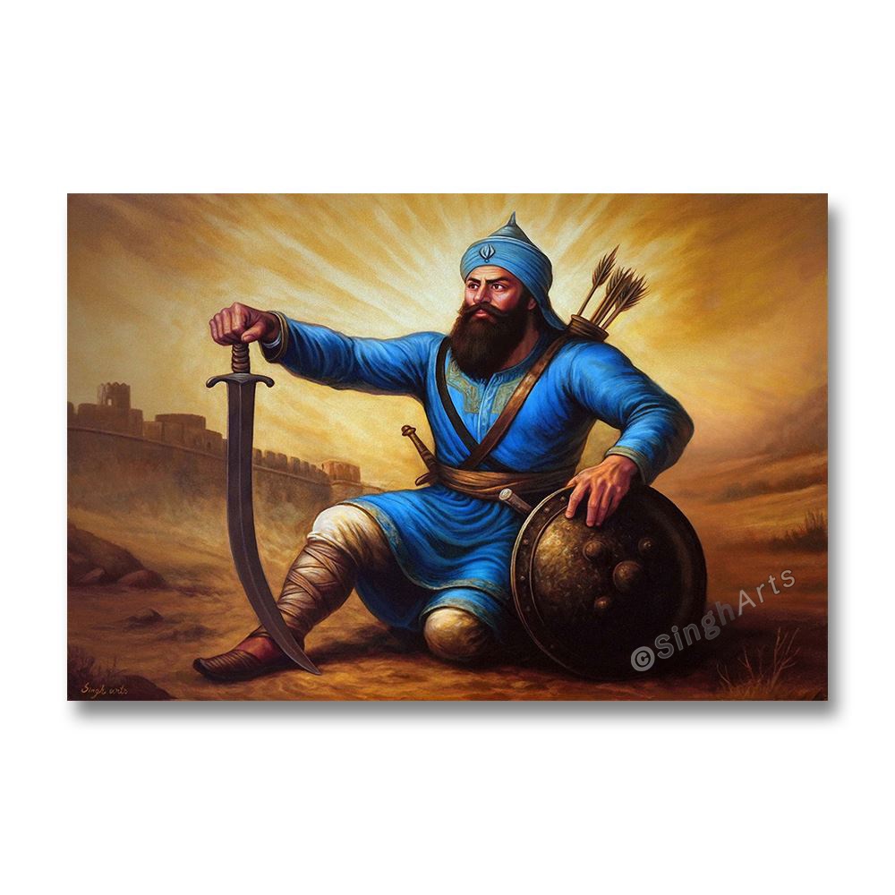 Overall, the painting reflects courage rooted in service, discipline guided by faith, and humility aligned with Sikh values. Banda Singh Bahadur is presented not as a conqueror, but as a servant-leader acting under divine guidance and collective responsibility.
