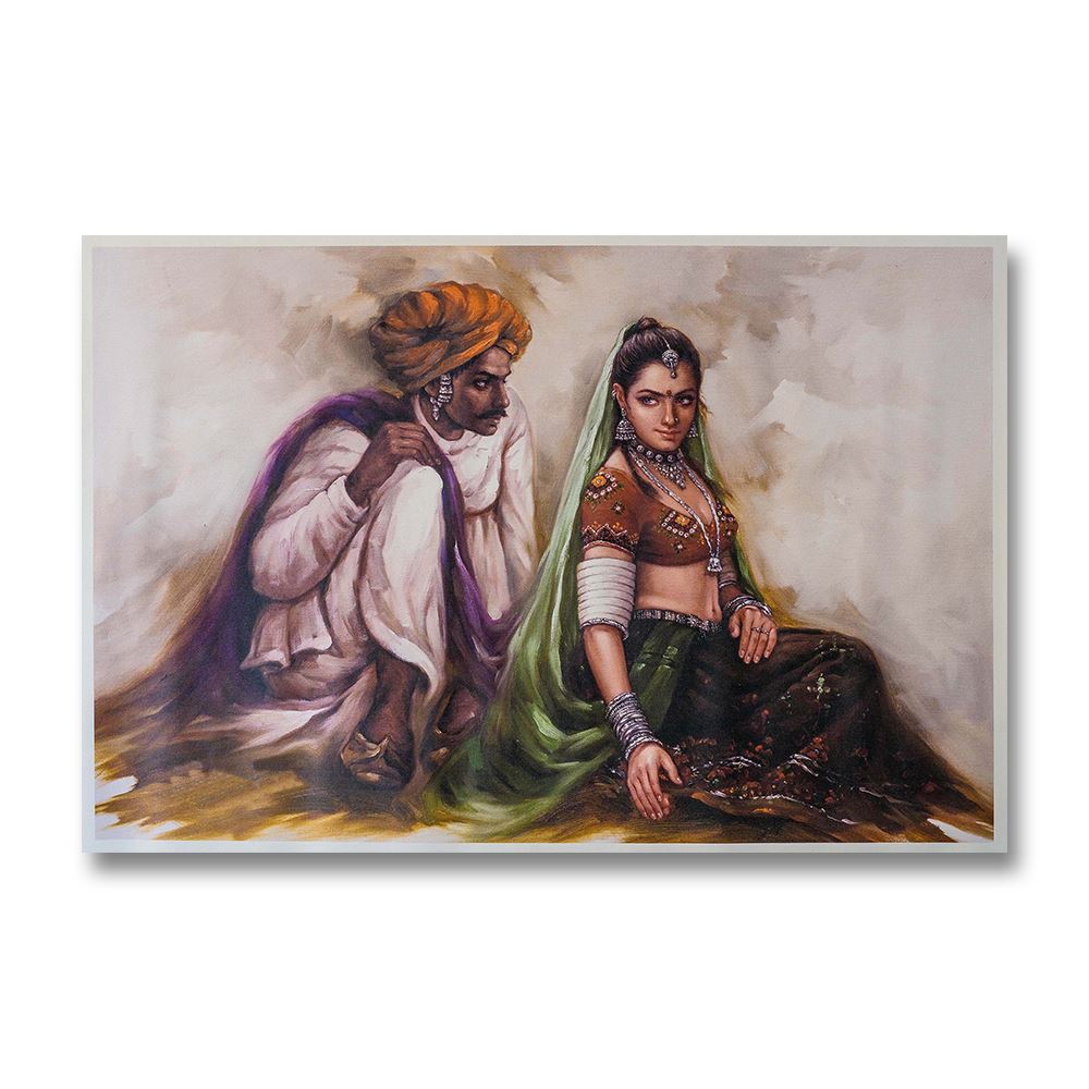 The artwork portrays a couple seated close to one another in a simple, undefined space, allowing the focus to remain on human emotion rather than surroundings. The man, dressed in traditional attire with a turban and draped cloth, leans slightly forward, his posture attentive and thoughtful. The woman sits calmly beside him, adorned in traditional Indian clothing and jewelry, her expression composed and self-assured. Together, they represent a scene rooted in cultural heritage and everyday life.