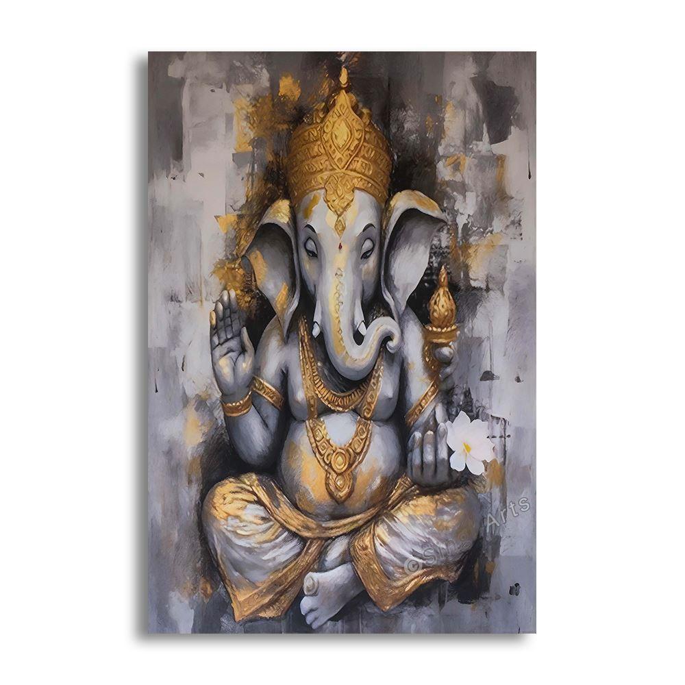 Ganesh Ji is adorned with traditional ornaments and a finely detailed crown, all touched with gold that softly emerges from the neutral background. In one hand, he offers blessings, symbolizing protection and reassurance, while the other holds a white flower, representing purity, devotion, and spiritual offering. The subtle textures and abstract brushwork in the background keep the focus centered on the deity without distraction.