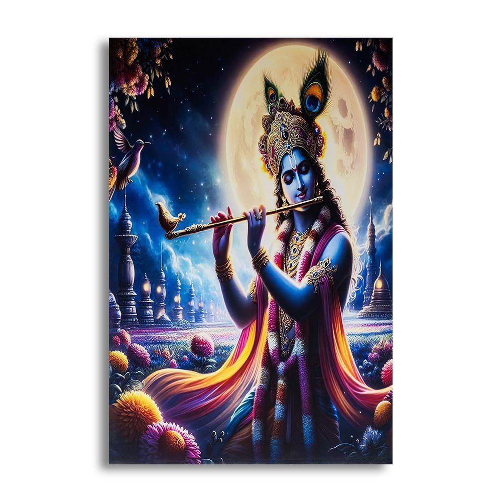 The artwork presents Lord Krishna Ji standing gracefully under a radiant full moon, immersed in the act of playing his sacred bansuri. His calm expression and half-closed eyes convey deep spiritual absorption, suggesting that the music flows not from effort, but from divine consciousness itself. The moonlight behind him forms a natural halo, emphasizing purity, serenity, and eternal presence.