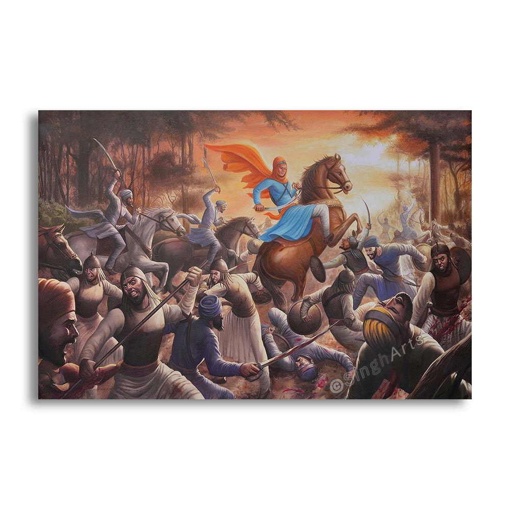 Overall, the painting honors Mata Bhag Kaur as a figure of disciplined bravery and selfless service. It reflects Sikh values of courage aligned with righteousness, humility within strength, and unwavering dedication to protecting justice.