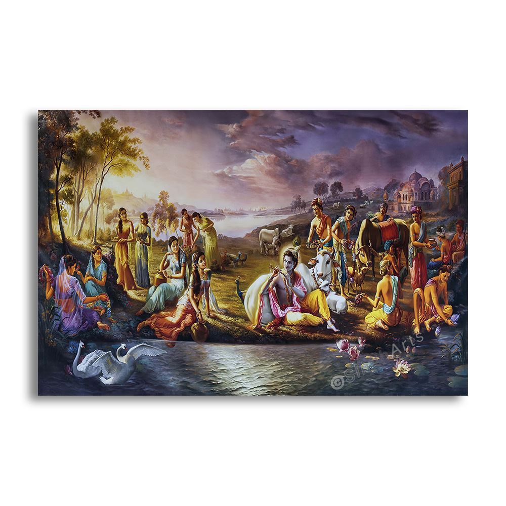 The surrounding environment—flowing water, trees, distant temples, and a softly glowing sky—creates a timeless, sacred atmosphere. This setting represents Vrindavan, the spiritual realm where divine play unfolds beyond material limitations. The balance between movement and stillness in the painting reflects the inner peace found through devotion.