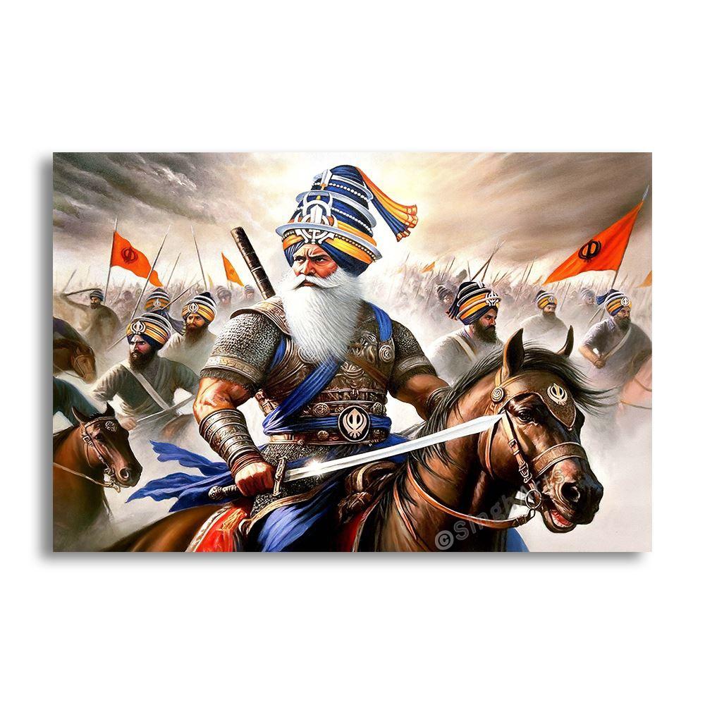 Symbolically, the sword represents righteous duty carried out in humility, while the horse signifies controlled strength and unwavering resolve. The gathered Sikhs behind him reflect unity, service, and shared responsibility. The scene emphasizes leadership through example, rooted in devotion rather than personal glory.