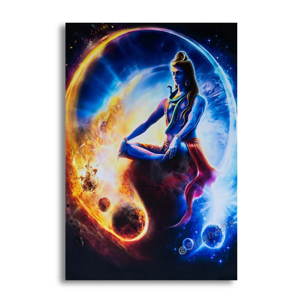 The painting presents Lord Shiva seated in deep meditation at the center of a vast cosmic sphere, embodying supreme stillness and infinite awareness. His calm posture, closed eyes, and composed expression reflect yogic discipline, detachment, and inner silence. The serpent around his neck signifies control over fear and ego, while his ascetic form represents transcendence beyond material existence.